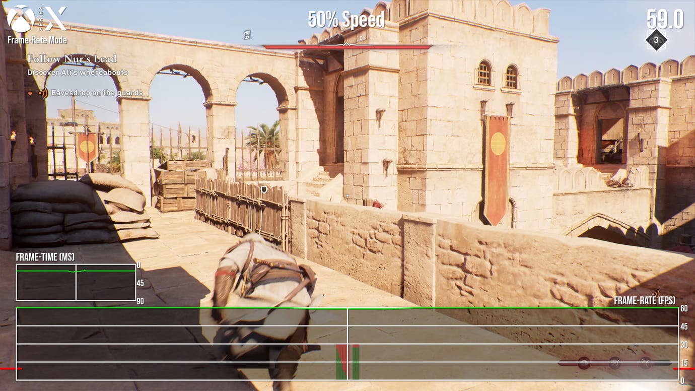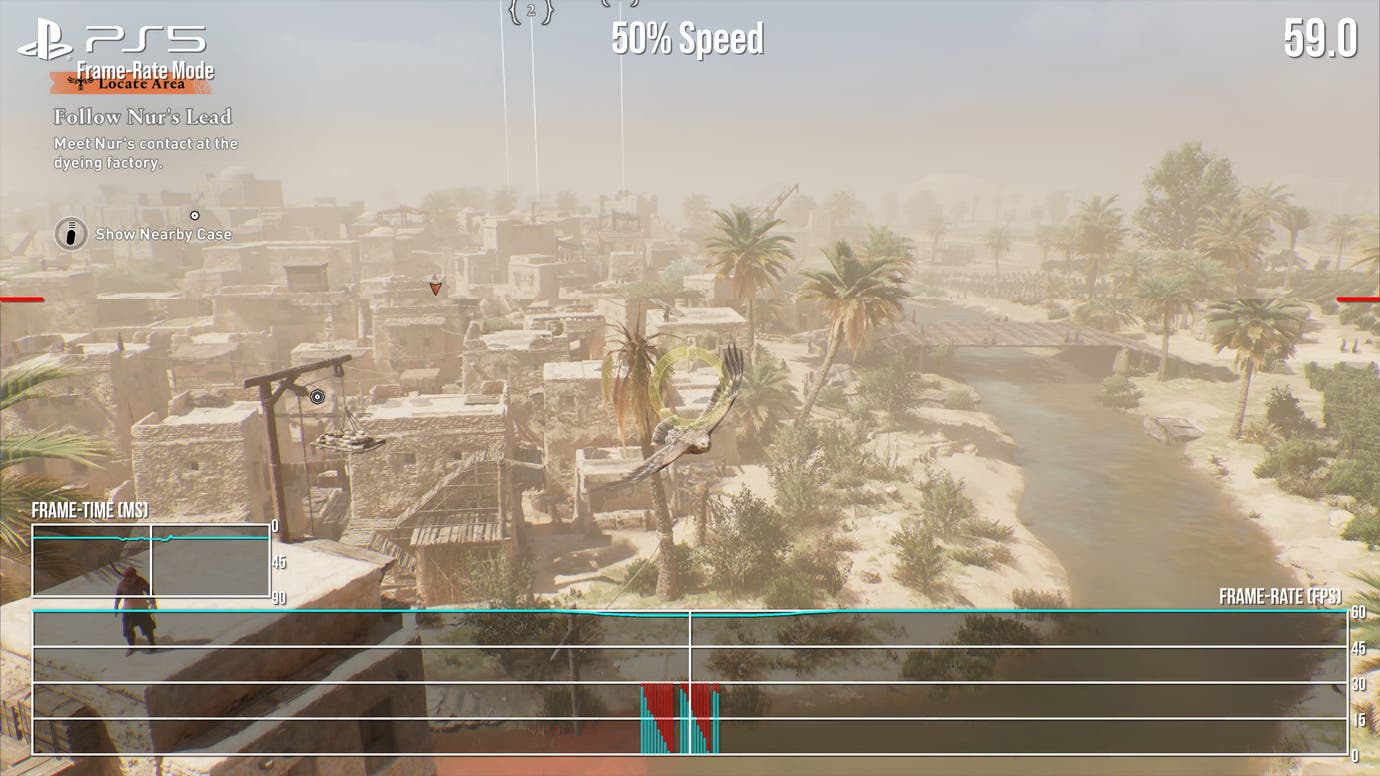 Was den Leistungstest angeht, wird erwartet, dass der Mirage ein ähnliches Profil wie die Serieneinträge davor haben wird. Es gibt gute Neuigkeiten, wenn Sie beim 30-fps-Qualitätsmodus bleiben möchten. Basierend auf den ersten drei bis vier Stunden Spielzeit sind das wasserdichte 30 fps auf jeder Konsole der aktuellen Generation. Während der Parkour-Bewegung beeinträchtigt das Lesen keinen einzigen Frame. Ob zu Pferd oder aus der Vogelperspektive über uns hinwegfliegend, die komplexe Innenstadt der Stadt fließt nahtlos ineinander über. Einfach ausgedrückt: Die Kamera des Mirage bleibt bei konstanten 30 Bildern pro Sekunde, egal was Sie tun.